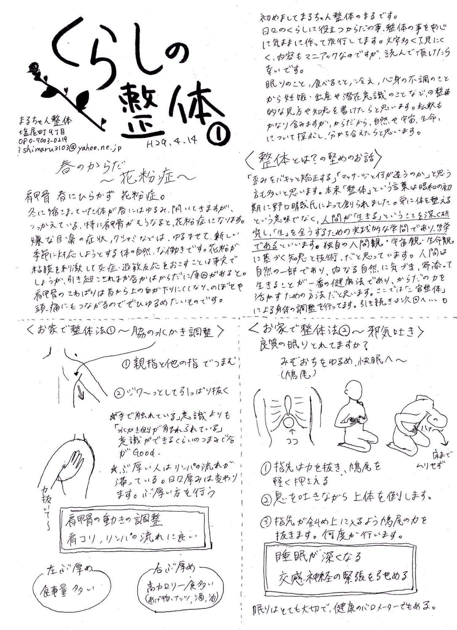 くらしの整体① くらしの整体 2017.04.21 このたび「くらしの整体」と題して通信はじめました。 来られた方、お会いした方には配っています。 手書きをスキャンしたデータなので見にくいかも知れません。 今回は ・整体とは ・花粉症 ・お家で整体法 を載せています。よかったらご覧下さい。